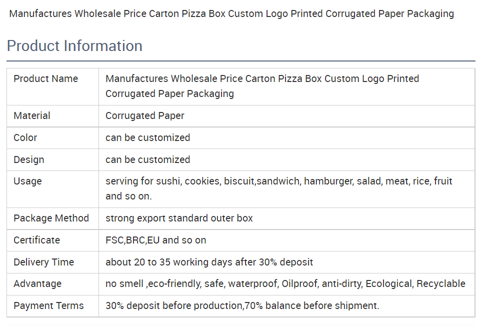 This full color printed corrugated pizza box is made with eco-friendly material and it's portable and safe for your pizza and other snacks. Could be customized in different sizes and printing artwork which brings your brand easy to be known.