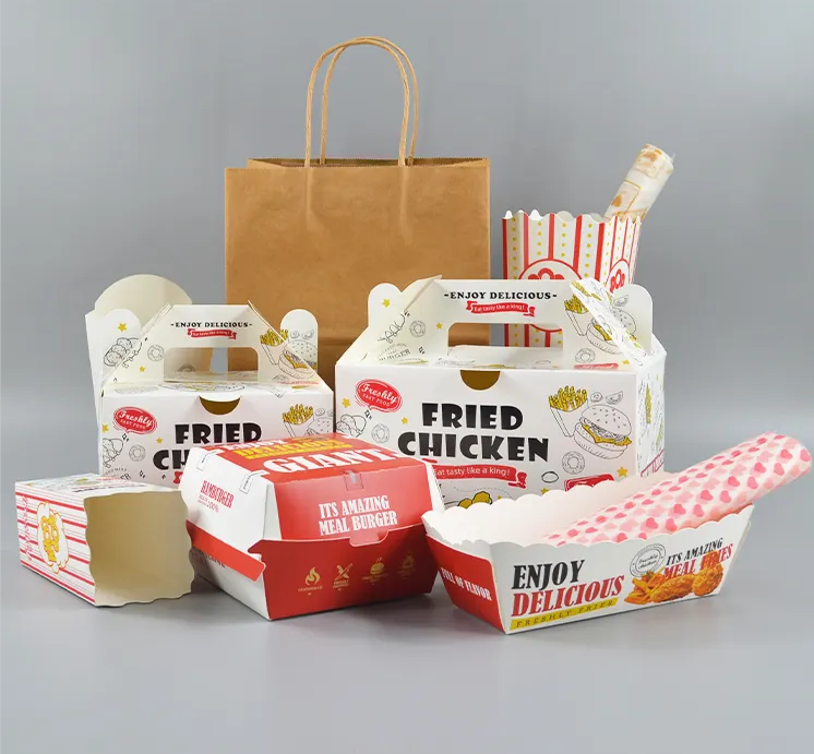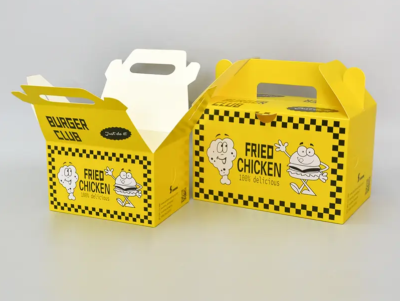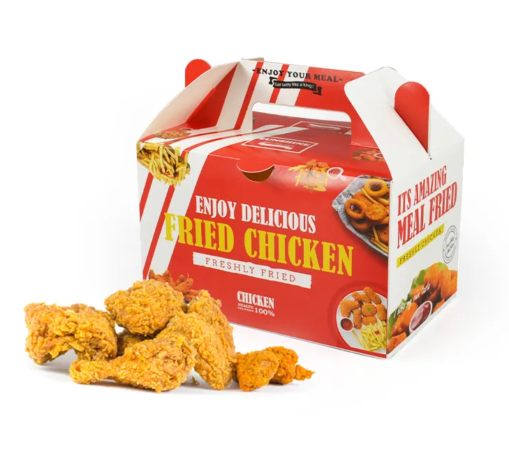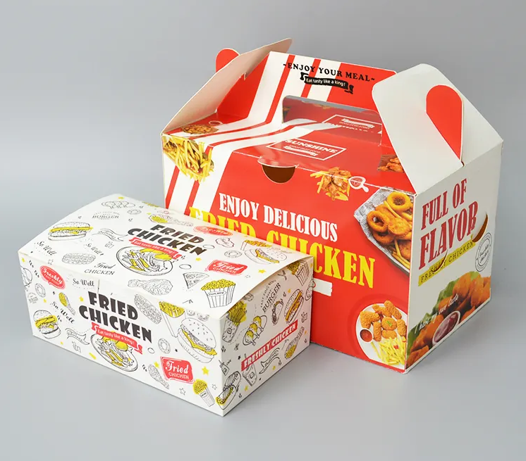 This box is made of food grade eco-friendly ivory cardboard paper and could be customized in different sizes and printing outside. It could be folded into flat when shipping and widely used in take away fast food industry.
