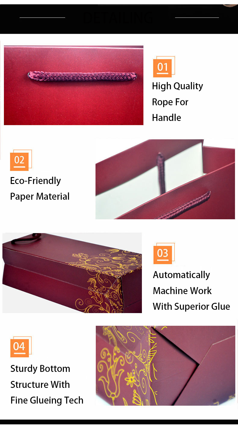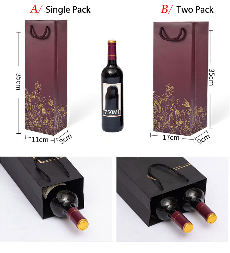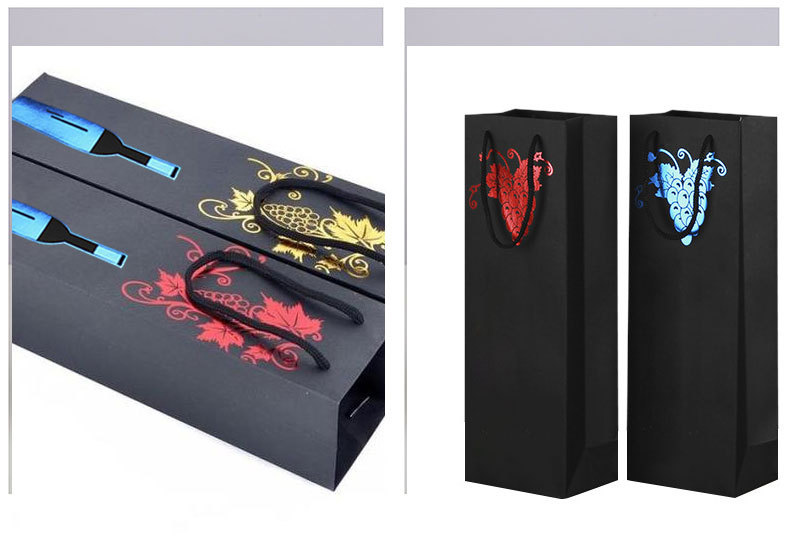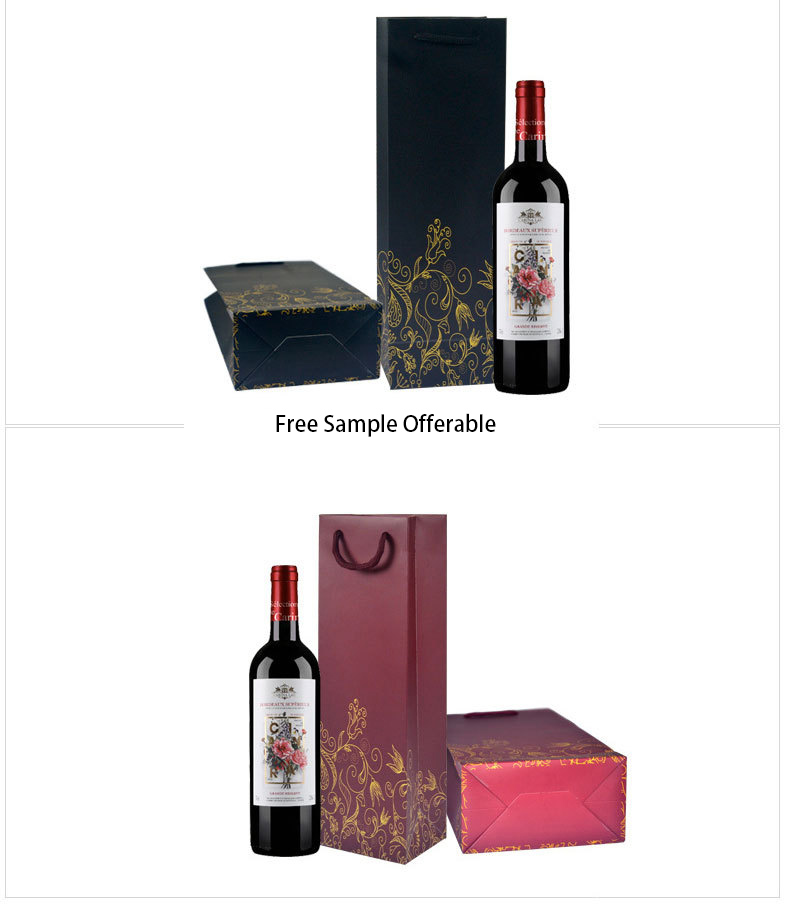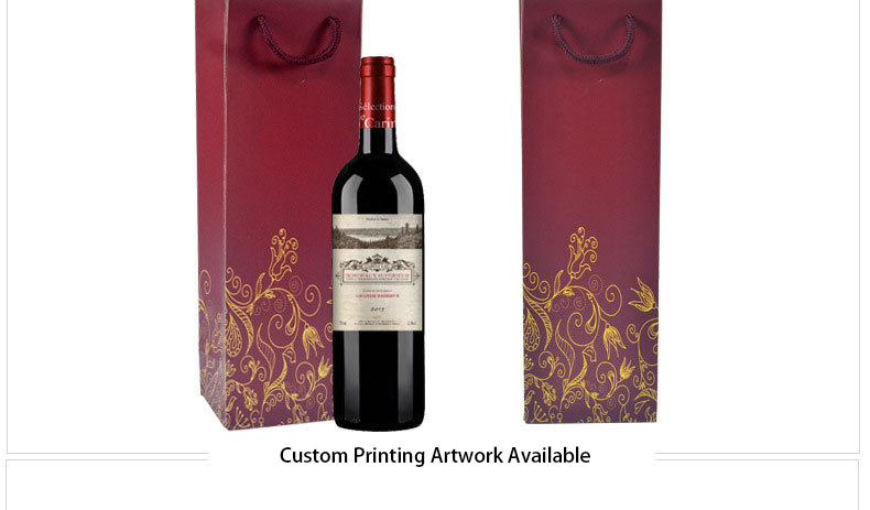This fine red wine bag is made of good quality ivory board paper with colorful different imprint or stamping artwork, with sturdy handle for carrying one or two bottle of wines. Suitable for gifts taking or company promotion.